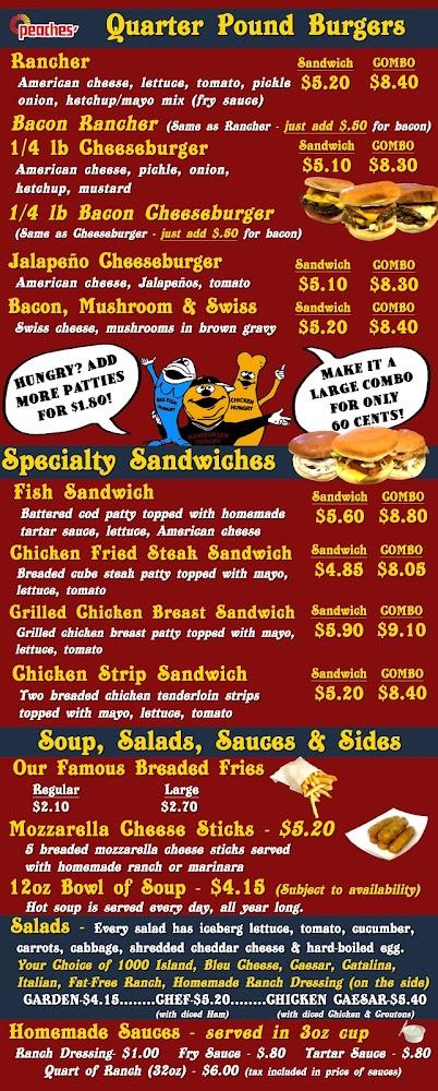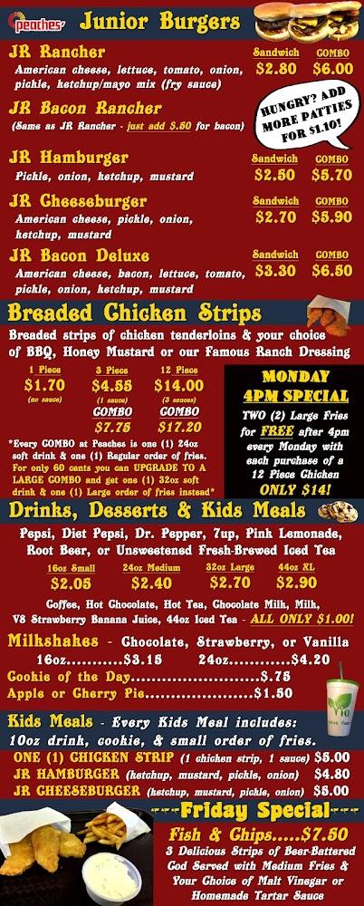 Don't miss the chicken strips. Made fresh daily, they have a reputation for quality and taste. The kids' meals ensure even the little ones leave happy. Desserts, especially milkshakes and cookies, complete every meal. Overall, Peaches delivers solid comfort food with wholesome ingredients.